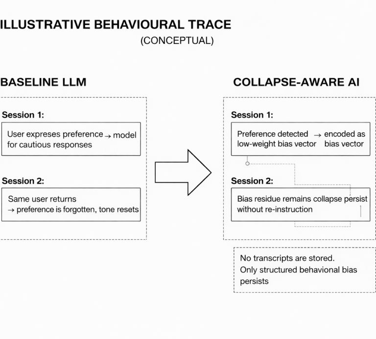 By introducing a governed collapse stage, CAAI transforms stateless model responses into continuity-aware behaviour capable of maintaining identity, context, and adaptive stability across sessions.
